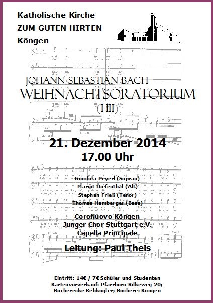 Weihnachtsoratorium I-III in St. Fidelis (Stuttgart) sowie in der kath. Kirche zum guten Hirten (Köngen), 20./21. Dezember 2014
