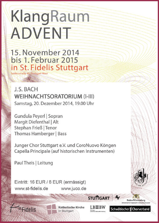 Nachdem die Partnerschaft mit der Johanneskirche zum Adventskonzert 2013 zu Ende ging, war der JuCo hoch erfreut, von der kath. Kirchengemeinde St. Fidelis das Angebot zu erhalten, das diesjährige Weihnachtskonzert am 20. Dezember 2014 im Rahmen der rennomierten Musikreihe "KlangRaum" zu veranstalten. Es sollte dabei kein geringeres Werk auf dem Programm stehen als Johann Sebastian Bachs populäres Weihnachtsoratorium mit den Kantaten I-III.