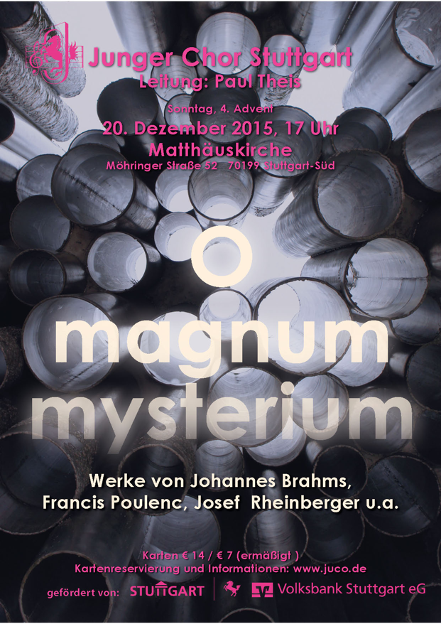 Am vierten Adventswochenende 2015 sollte dem Juco eine doppelte Premiere bevorstehen: Am Samstag war erstmalig ein Konzert unseres Chors in der Tübinger Stiftskirche geplant, im Rahmen der renommierten Musikreihe "Tübinger Motette". Und am Sonntag drauf sollte unser erster großer Auftritt in der neuen "musikalischen Heimatstätte" St. Matthäus in Stuttgart-Heslach stattfinden. Und als wäre dies allein nicht schon Ansporn genug, hatten wir uns zudem noch ein anspruchsvolles A-Capella-Repertoire zum Thema " O Magnum Mysterium" vorgenommen, mit Chormusik aus unterschiedlichsten Ländern und Musikrichtungen: Vom doppelchörigen Wechselgesang der Renaissance und melodischen Adventsmotetten der Romantik bis hin zu spannungsreichen Chorstücken der Moderne - alles sollte im diesjährigen Programm vertreten sein und natürlich auch stilgerecht interpretiert werden!