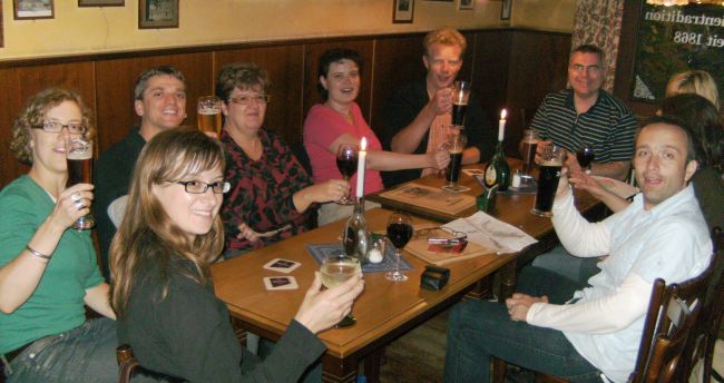 Samstagabend in Dublin ging’s nochmal zurück in die City ins „Cafe en Seine“, in dem wir bereits eine knappe Woche zuvor unser erstes irisches Bier geschlürft hatten (Smithwick’s/ Guinness/ Harp und auch Cider: alles sehr leckeres Gebräu). Heute war die Location ziemlich voll, und wir hatten Mühe, noch ein Plätzchen für unsere größere Gruppe zu finden. Nach unserer ersten Getränkerunde begann man, die Tanzfläche freizuräumen. Und obwohl die "Mucke" nicht immer ganz unserem Musikgeschmack entsprach, zuckte doch das Tanzbein zum gleichmäßigen Beat und wir hotteten los. Wir steigerten uns beim Mitsingen und mit Nachahmungen bzw. Tanzeinlagen diverser Art, bis Ekki, den wir alle schon als "Neu-JuCorianer" ins Herz geschlossen hatten, zur Krönung des Abends eine gelungene Status-Quo-Imitation auf seiner Stoffjacken-Gitarre vorführte – der Böööhrner des Abends! Ausgepowert, angeheitert und mit Bauchschmerzen vom vielen Kichern schoben wir uns durch die Massen aus dem Club, vor dem auch mitten in der Nacht noch scharenweise Leute anstanden. Die Iren wissen offenbar zu feiern und ihr Leben zu genießen... ein sehr sympathisches Völkchen!