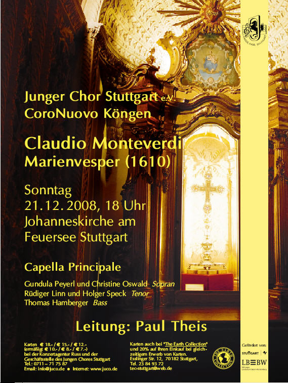 Die „Vesperae Beatae Mariae Virginis" von Monteverdi ist für viele einer der aufregendsten Kompositionen der Musikgeschichte. Und für Laienchöre wie den Jungen Chor Stuttgart und den CoroNuovo Köngen ein spannendes Projekt. Gemeinsam wurde Monteverdis opus magnum von 1610 am 4. Adventwochenende in Köngen sowie in der Johanneskirche am Feuersee in Stuttgart aufgeführt. Kraftvoll war der Beginn in der Toccata „Deus in adjutorium“, die Monteverdi auch an den Beginn seiner Oper L’Orfeo setzte. Den beeindruckenden Variantenreichtum Monteverdis haben die Sänger und Instrumentalisten äußerst dynamisch vorgetragen. Liebliche Phrasen wechselten mit temporeichen doppelchörigen Passagen, die durch Crescendi und Decrescendi lebendig interpretiert wurden.