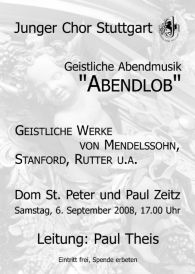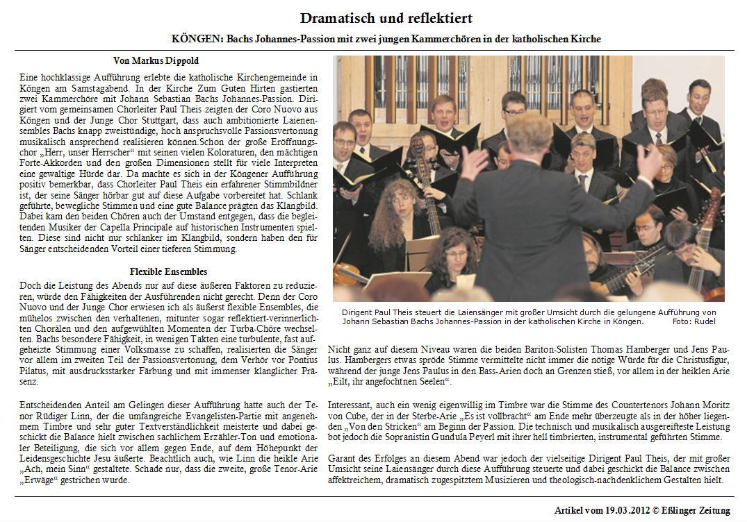 Der Junge Chor Stuttgart wurde 1967 von Schülern und Studierenden gegründet. Seit 14 Jahren leitet ihn Paul Theis, in der Region vor allem bekannt durch seine Auftritte als Organist im Duo mit dem Trompeter Bernhard Kratzer.