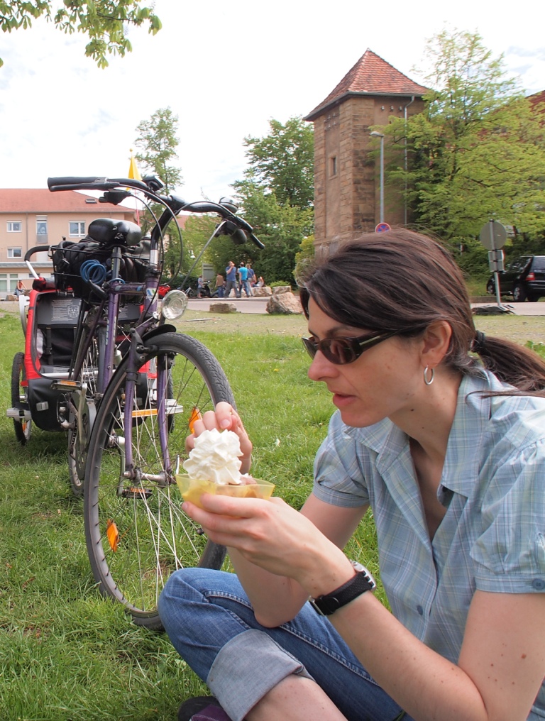 Ursprünglich wollte ein Teil des Chores am nächsten Tag eine Radtour entlang der Saale machen. Das Wetter war allerdings so unbeständig, dass diese kurzerhand abgesagt wurde und alle gemeinsam nach Leipzig fuhren. Während die Jüngsten (Toni, Katrin und Franzi) sich schwer seufzend ihrem Schicksal ergaben („Jetzt muss ich schon wieder Häuser angucken!“) erkundeten die meisten von uns gespannt die Stadt mit den vielen Passagen, den beiden bedeutenden Kirchen, der Nikolai- und der Thomas-Kirche, und den engen Straßen mit den schön renovierten Häusern. Katrin verschaffte ihrer Langeweile Abhilfe – das Kind fiel buchstäblich in den Brunnen, was einen Spontaneinkauf bei Karstadt zur Folge hatte. Ziemlich platt trafen wir uns nach 5 Stunden – bei herrlichem Sonnenschein – wieder und fuhren nach Kretzschau in die Jugendherberge. Dort war Ostalgie-Flair pur angesagt! Vor allem Anke und Uli freuten sich über das Geschirr ihrer Kindheit und die Utensilien aus „Plaste“. Schon recht müde probten wir abends unser geistliches Programm, das wir am nächsten Tag im Dom zu Zeitz aufführten.