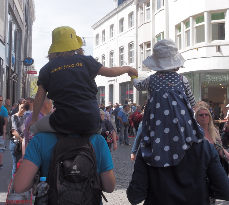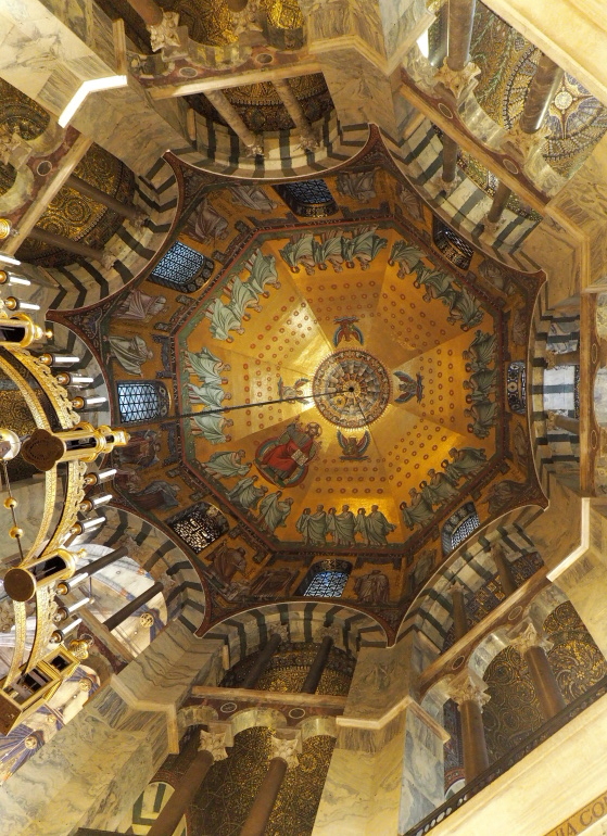 Das Wetter hatte offenbar die gleiche gute Laune wie wir alle und so kamen wir bei weiterhin strahlendem Sonnenschein gegen Mittag in unserem Hotel am Marschiertor an. Die Juco'ler und ihre Familienbegleitungen schwärmten auch gleich für einen ersten Rundgang in die Aachener City aus, und nahmen einen Mittags-Snack, eine Kugel Eis (oder zwei...) und ein erstes Sonnenbad zu sich. Anschließend versammelten wir uns zur Domführung, in der uns viele Fakten zum Wahrzeichen der Stadt, den seinerzeit größten freischwebenden Kuppelbau nördlich der Alpen, erläutert wurden. Erbaut in karolingischem, gotischem und barockem Stil, erlangte er insbesondere als Krönungsort römisch-deutscher Könige Bekanntheit, die dafür den berühmten Karlsthron bestiegen. Am beeindruckendsten stellte sich v.a. das Oktogon im Zentrum des Gotteshauses heraus, das mit seinen glitzernden Mosaiken an byzantinische Bauten erinnerte. Direkt danach folgte eine Stadtführung quer durch Aachens Innenstadt. Hier erfuhren wir Interessantes über die römischen Ursprünge der Stadt, ihre Thermal- und Heilquellen samt der stilvollen Schinkelschen Elisenbrunnen-Hallen, die alte Kaiserpfalz mit Katschhof und Rathaus, das überall zwischen den Pflastersteinen zu findende Karolus-Symbol, die besten lokalen Printenbäcker (samt Verkostung... lecker!) sowie nicht zuletzt auch den renommierten Karlspreis, der dieses Jahr just am nächsten Tag in Rom an den Pontifex Franziskus höchstpersönlich verliehen werden sollte. Und woran konnte man sofort feststellen, dass eine Gruppe aus dem Schwabenländle unterwegs war? Daran, dass viele leere Trinkflaschen unter den Mösche-(Spatzen)-Brunnen am Münsterplatz gehalten wurden, um sie (natürlich gratis!) mit frischem, kühlem Wasser zu füllen... :-)