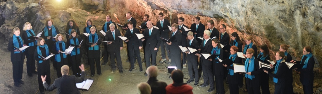 Also starteten wir um Punkt 20:00 Uhr in unser erstes Herbstkonzert an diesem Ort. Ein gut gelaunter und zu Scherzen aufgelegter Chorleiter Paul Theis begrüßte das Publikum und führte es gewohnt nonchalant durch einen Querschnitt des Juco-Repertoires. Auf dem Programm standen vor allem weltliche Werke aus mehreren Jahrhunderten und musikalischen Stilrichtungen. Ein frisches "Audite Silete" bildete den Auftakt, andächtig gefolgt von "Silver Swan", einer lyrisch-melancholischen Schwanengesang-Vertonung von O. Gibbons. Auf das sehr dynamisch intonierte Spiritual "Deep River" folgte bereits ein sehr kräftiger Applaus der Zuhörer. So angespornt setzten wir alles daran, sie weiter in unseren Bann zu ziehen - sei es beim rhythmischen "Soon ah will be Done" oder bei den getragenen und ein wenig sentimentalen Stücken aus Nordeuropa. Begeistert kündigte unser Maestro dann das nächste Stück an, als er über die spontane 'Flashmob'-Aktion letztes Jahr während unserer Finnland-Reise berichtete, als wir beim Anstimmen von Sibelius' "Finlandia" für ein paar Minuten das hektische Treiben im Hauptbahnhof von Helsinki zum Innehalten brachten und einige Finnen von unserem Gesang sichtbar ergriffen waren. Entsprechend patriotisch und innig gelang uns denn auch der Vortrag dieses Werks. Ebenfalls großen Anklang beim Publikum fand das von uns künstliche erzeugte Echo im versetzt gesungenen "Che Bon Echo" von O. di Lasso. Dieses Werk kam in der Atmosphäre der Nebelhöhle besonders gut zur Geltung - just wie es unser Chorleiter vorausgesagt hatte. :-) Bei den folgenden Brahms-Stücken waren wir nun endgültig 'in unserem Element' angekommen. Sowohl das sanfte "Abendständchen" als auch das im Barcarolen-Rhythmus schwingende "Vineta" kamen sehr gut an. Ja, an diesem besonderen Ort machte das Singen wirklich großen Spaß, und es gelang uns nicht nur für eine lauschige Konzertatmosphäre zu sorgen, sondern auch ein wenig mit unserem Publikum zu 'interagieren'. Denn nun war die Meinung der Zuhörer gefragt, ob wir denn noch kurz den Messias von Händel einschieben könnten? Sie stimmten zum Glück zu, also fassten wir uns höflicherweise kurz mit einer Fassung, die kaum länger dauerte als drei Minuten. Die abschließenden Popstücke (u.a. "Michelle" / "Blackbird" von den Beatles sowie die Gies-Arrangements von Grönemeyers "Mambo" und Mendelssohns "O Täler weit") präsentierten wir stilsicher mit dem nötigen 'Groove'. Einmal mehr stellte sich der 'Parkplatzregen' als Publikumsliebling heraus - Mitklatschen inklusive! Das dezente "Kein schöner Land" bildete den Abschluss in einem Programm, in dem jedoch eher die besinnlich-ruhigen Werke die Akzente setzten. Wir genossen den abschließenden Applaus, der überaus überschwänglich und herzlich war. Natürlich kamen wir der Forderung nach einer Zugabe gerne nach und beendeten auch diese passenderweise mit einem Piano-Schlussakkord.