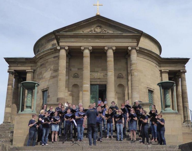 Im wunderschönen Wonnemonat Mai wagte sich der Juco buchstäblich auf „neues Terrain“, genauer gesagt auf die Treppe vor der berühmten Rotenberger Grabkapelle bei Cannstatt, als wir dort erstmalig im Rahmen eines kleinen Chorwettbewerbs für 3 Stuttgarter Sing-Ensembles konzertieren durften. Ein Auftritt im Freien ist immer eine besondere Herausforderung, und so hofften wir nicht nur auf gutes Wetter - und Petrus meinte es an dem Tag wirklich gut mit strahlendem Sonnenschein - sondern auch auf einen musikalisch gelungenen Vortrag mit diesen schwierigen akustischen Verhältnissen.