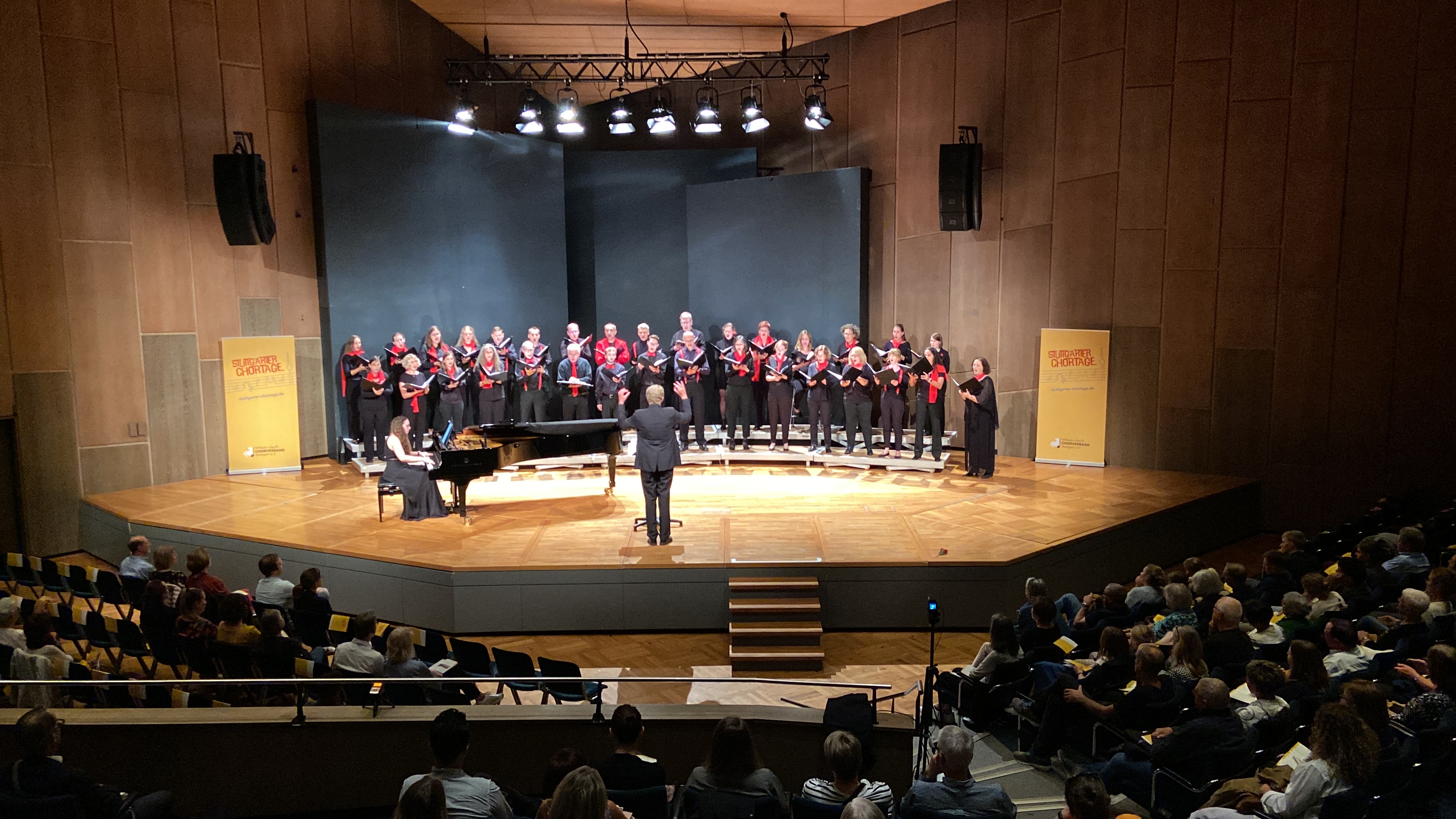 Ein Auftritt in der Stuttgarter Liederhalle: da konnte uns auch Freitag, der 13., nicht abhalten. Mit neuer Chorkleidung waren wir auf jeden Fall gut vorbereitet. Im Rahmen der Stuttgarter Chortage führten wir im Mozartsaal unser zweiteiliges Programm "Vom Solo-Lied zum Chor-Lied" auf. Wir wählten französische Kompositionen der Romantik von Camille Saint-Saëns und Gabriel Fauré aus, aber auch deutsche Lieder von Peter Cornelius, Hugo Wolf und Fanny Hensel, die von Denis Rouger arrangiert wurden. Ergänzend sangen wir einen englischen Lied-Zyklus von Edward Elgar. Begleitet wurden wir am Flügel von der einzigartigen Teresa Kratzer.