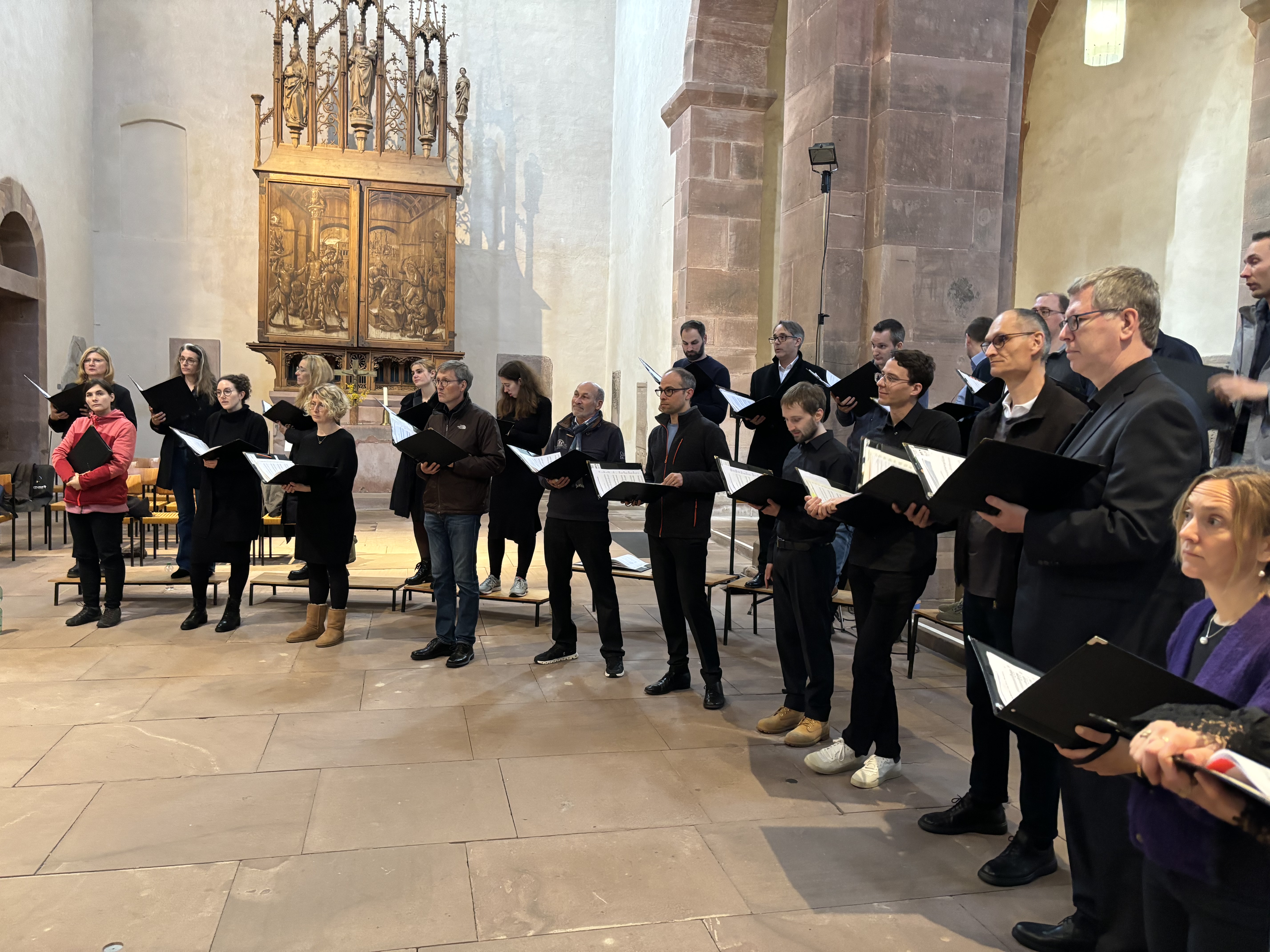 Da wir der letzte Chor an diesem Veranstaltungsort waren, nutzten wir die Gelegenheit und führten noch ein Stück aus unserem weltlichen Programm auf, um Werbung für unser zweites Konzert am Sonntag zu machen. Die Wirkung unseres Auftritts zeigte sich in der angenehm ruhigen Atmosphäre, welche sich über das Publikum übertrug. Erstaunlich viele Zuhörerinnen und Zuhörer harrten das gesamte Programm über im Münster aus und der Spannungsbogen wurde auch nicht durch Applaus durchbrochen, wie sonst leider üblich.