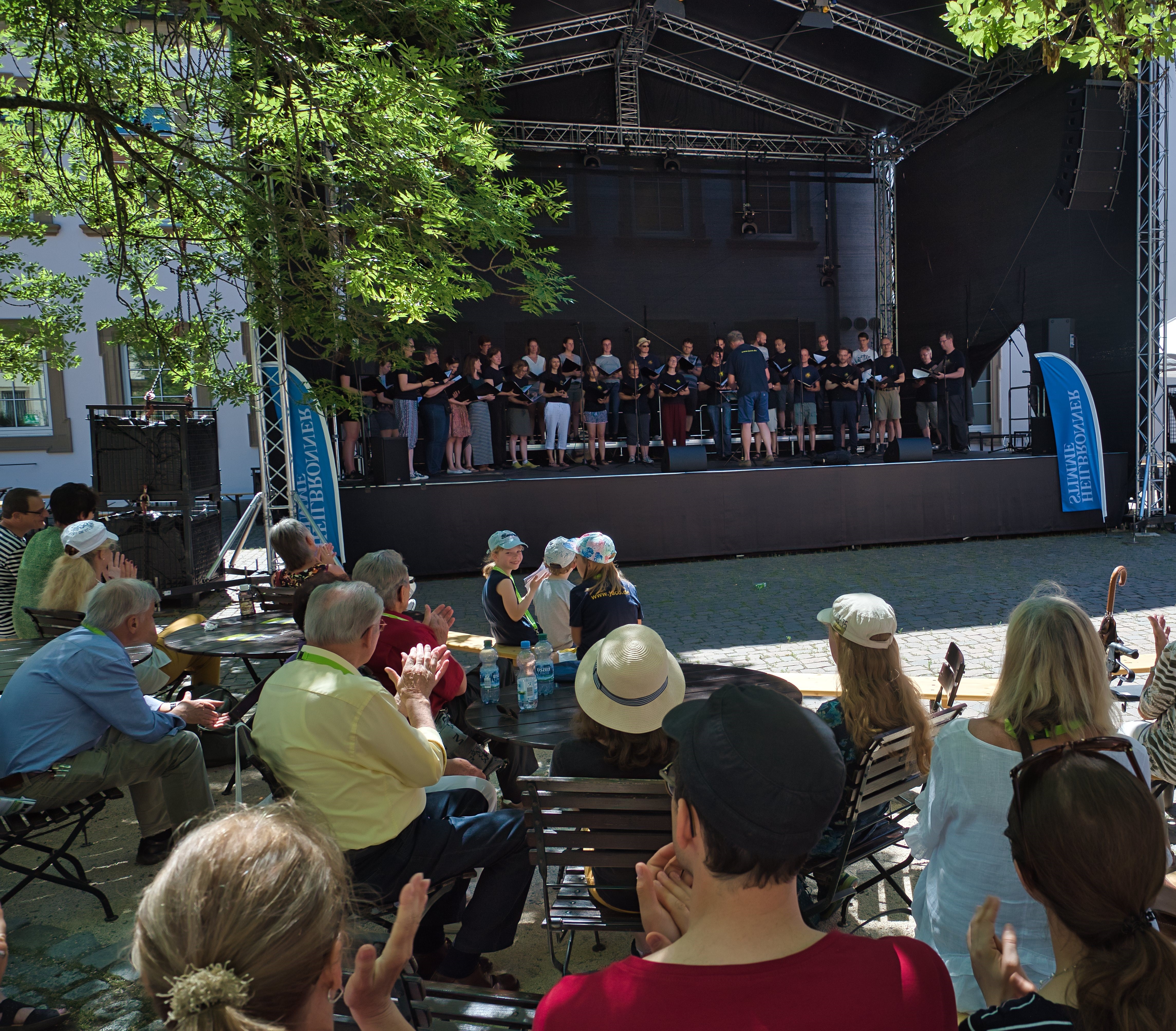 Das weltliche Programm trug der Chor auf der open air Bühne im Deutschhof Innenhof vor. Auch hier wusste unser Dirigent die Aufmerksamkeit des zunächst sehr unruhigen Publikums auf das Programm zu richten. Unser Programm sowohl mit Arrangements diverser Popsongs, u. A. „Only you“ von V. J. Martin und „Mambo“ von H. Grönemeyer, als auch die anspruchsvolle Bearbeitung des Volksliedes „Die Gedanken sind frei“ von Oliver Gies zog unser Publikum in den Bann. Man konnte zwischenzeitlich sogar die Kühlanlage des Bierwagens hören...;)