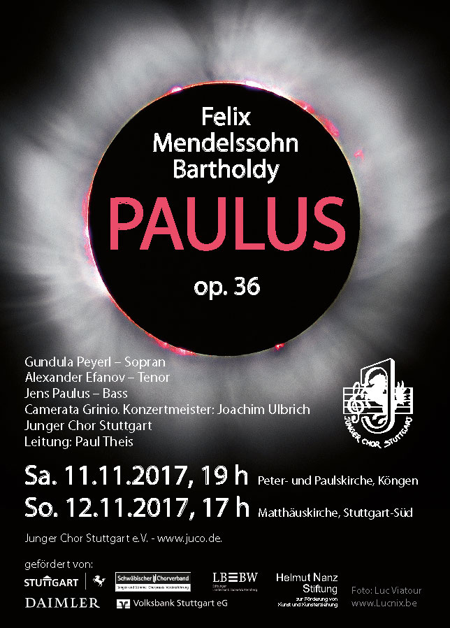 Für sein 50. Jubiläumsjahr hatte sich der Junge Chor Stuttgart einiges vorgenommen. Dieser feierliche Anlass sollte, angepasst an das breit gefächerte Repertoire des Chores, sowohl mit einem weltlichem Konzert, welches bereits im Juli stattfand, als auch mit einem Kirchenkonzert gefeiert werden. Die Auswahl des Chores fiel auf ein nicht allzu häufig aufgeführtes Oratorium von Mendelssohn Bartholdy: Das Paulus-Oratorium. Das Ensemble stellte sich somit sowohl der musikalischen Herausforderung, ein großes Oratorium innerhalb weniger Monate einzustudieren, als auch dem wirtschaftlichen Risiko, welches die Aufführung mit einerseits nicht unerheblichen Ausgaben, andererseits jedoch schwer kalkulierbaren Einnahmen darstellte. Umso bedauerlicher ist es für die Veranstalter, dass die Stuttgarter Matthäuskirche gerade mal gut zur Hälfte gefüllt war.