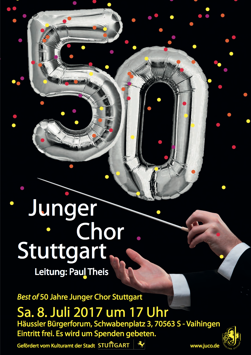 "Best of 50 Jahre Juco"- so lautete das Motto am 8.7.2017 für das Jubiläumskonzert des Jungen Chors Stuttgart e.V. (Juco). Die schwüle Hitze an jenem Samstag bot nicht gerade ideale Bedingungen für diesen besonderen Anlass... und dennoch versammelten sich zahlreiche Zuhörer im immerhin wohl klimatisierten Rudi-Häussler-Saal des Bürgerforums in Stuttgart-Vaihingen, darunter waren auch viele Fans und Ehemalige des Chores.