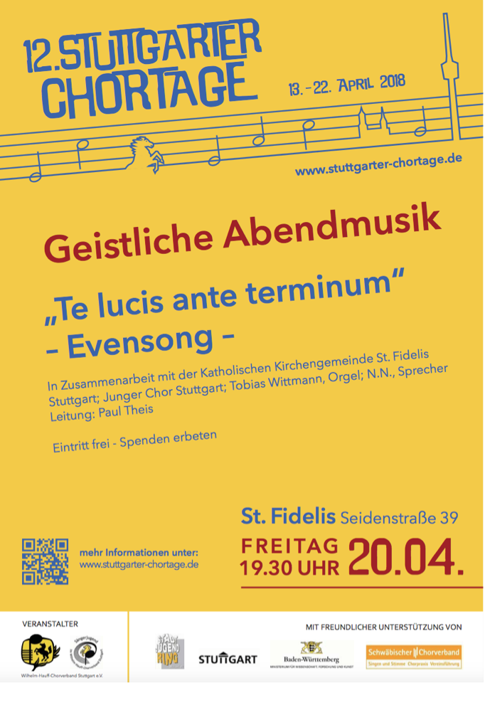 Am Freitag, den 20. April 2018 um 19.30 Uhr, hat der Junge Chor Stuttgart e.V. unter der Leitung von Paul Theis einen „Evensong“ (Abendlob) in der katholische Kirche St. Fidelis gestaltet.