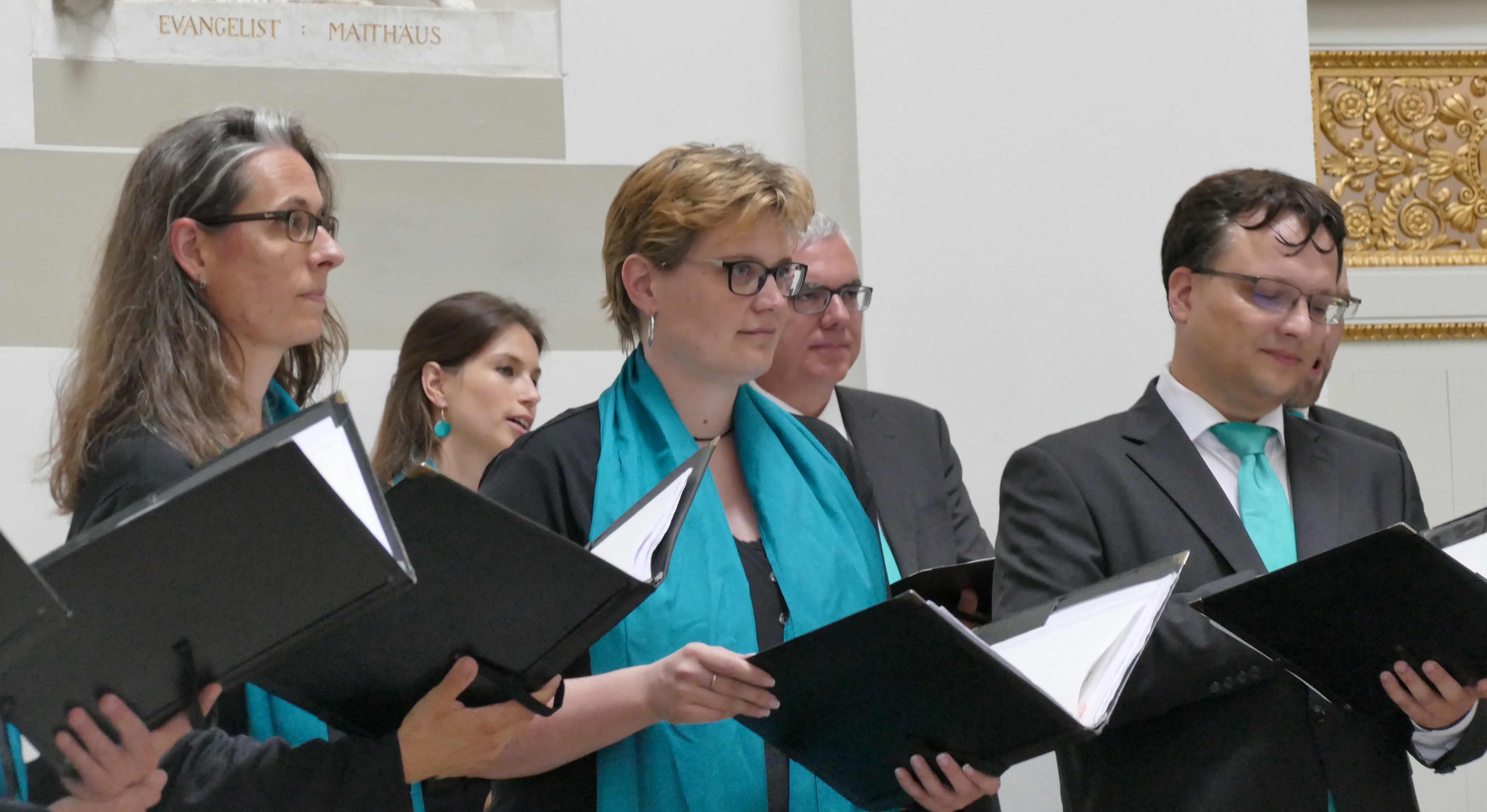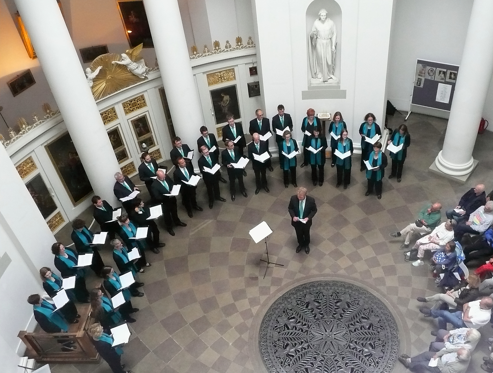Auch die weltlichen Stücke meisterten wir und unsere Solisten aus eigenen Reihen sehr souverän: Sowohl das sich langsam und energisch steigernde „Die Gedanken sind frei“, „Blackbird“ mit dem kecken Solo-„Pfeifen“ von Alexandra, als auch „O Täler Weit“ mit Matthias‘ und Ankes synkopischem Zwischengesang sowie Michael mit seiner einfühlsam intonierten Bariton-Sequenz beim Refrain von Billy Joels „And so it goes“ wussten zu überzeugen. Bei letzterem Stück lauschte sogar die in der Kapelle beheimatete Kirchenmaus andächtig mit, bevor sie durch die Reihen der weiter konzentriert musizierenden JuCo-SängerInnen davon huschte. Das stimmungsvolle und variantenreiche Programm beschlossen wir mit einem temperamentvollen „Salmo“ des brasilianischen Komponisten E. Aguiar, dessen Fortissimo-Schlussakkord in der Kuppel nur langsam verhallen wollte.
