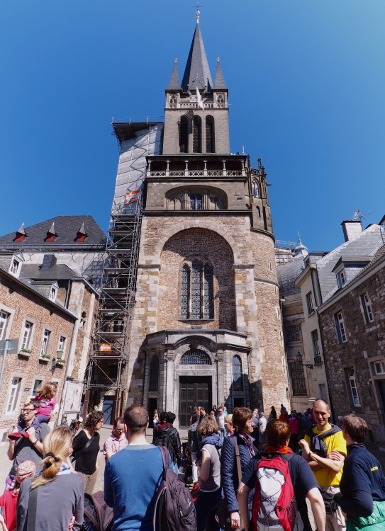 Das Wetter hatte offenbar die gleiche gute Laune wie wir alle und so kamen wir bei weiterhin strahlendem Sonnenschein gegen Mittag in unserem Hotel am Marschiertor an. Die Juco'ler und ihre Familienbegleitungen schwärmten auch gleich für einen ersten Rundgang in die Aachener City aus, und nahmen einen Mittags-Snack, eine Kugel Eis (oder zwei...) und ein erstes Sonnenbad zu sich. Anschließend versammelten wir uns zur Domführung, in der uns viele Fakten zum Wahrzeichen der Stadt, den seinerzeit größten freischwebenden Kuppelbau nördlich der Alpen, erläutert wurden. Erbaut in karolingischem, gotischem und barockem Stil, erlangte er insbesondere als Krönungsort römisch-deutscher Könige Bekanntheit, die dafür den berühmten Karlsthron bestiegen. Am beeindruckendsten stellte sich v.a. das Oktogon im Zentrum des Gotteshauses heraus, das mit seinen glitzernden Mosaiken an byzantinische Bauten erinnerte. Direkt danach folgte eine Stadtführung quer durch Aachens Innenstadt. Hier erfuhren wir Interessantes über die römischen Ursprünge der Stadt, ihre Thermal- und Heilquellen samt der stilvollen Schinkelschen Elisenbrunnen-Hallen, die alte Kaiserpfalz mit Katschhof und Rathaus, das überall zwischen den Pflastersteinen zu findende Karolus-Symbol, die besten lokalen Printenbäcker (samt Verkostung... lecker!) sowie nicht zuletzt auch den renommierten Karlspreis, der dieses Jahr just am nächsten Tag in Rom an den Pontifex Franziskus höchstpersönlich verliehen werden sollte. Und woran konnte man sofort feststellen, dass eine Gruppe aus dem Schwabenländle unterwegs war? Daran, dass viele leere Trinkflaschen unter den Mösche-(Spatzen)-Brunnen am Münsterplatz gehalten wurden, um sie (natürlich gratis!) mit frischem, kühlem Wasser zu füllen... :-)