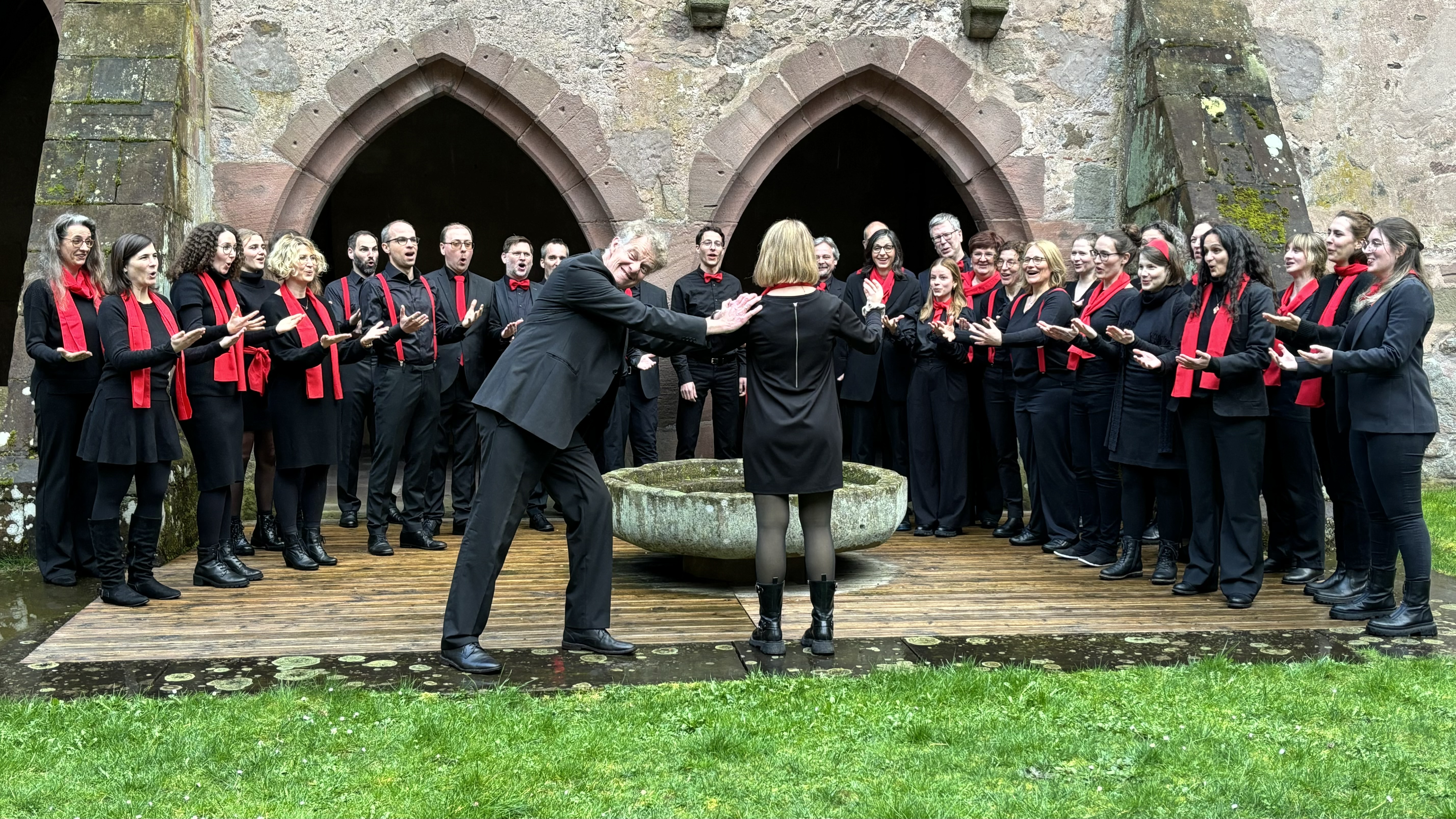 Da das Schulfranzösisch bei dem ein oder anderen aus unserem Publikum vielleicht etwas eingerostet ist, trugen Sängerinnen und Sänger aus dem JuCo zwischendurch die Liedtexte vor. Sogar für uns im Chor gab es dadurch hier und da Aha-Effekte. Auch wenn wir keine professionelle Sprecherausbildung genossen haben, gelang es uns vor allem bei Camille Saint-Saëns „Chant de ceux qui sèn vont sur mer“ - zu deutsch „Lied derer, die zur See fahren“ - beeindruckend ausdrucksstark, ja bühnenreif.