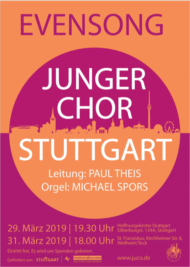 Am Freitag, den 20. April 2018 um 19.30 Uhr, hat der Junge Chor Stuttgart e.V. unter der Leitung von Paul Theis einen „Evensong“ (Abendlob) in der katholische Kirche St. Fidelis gestaltet.