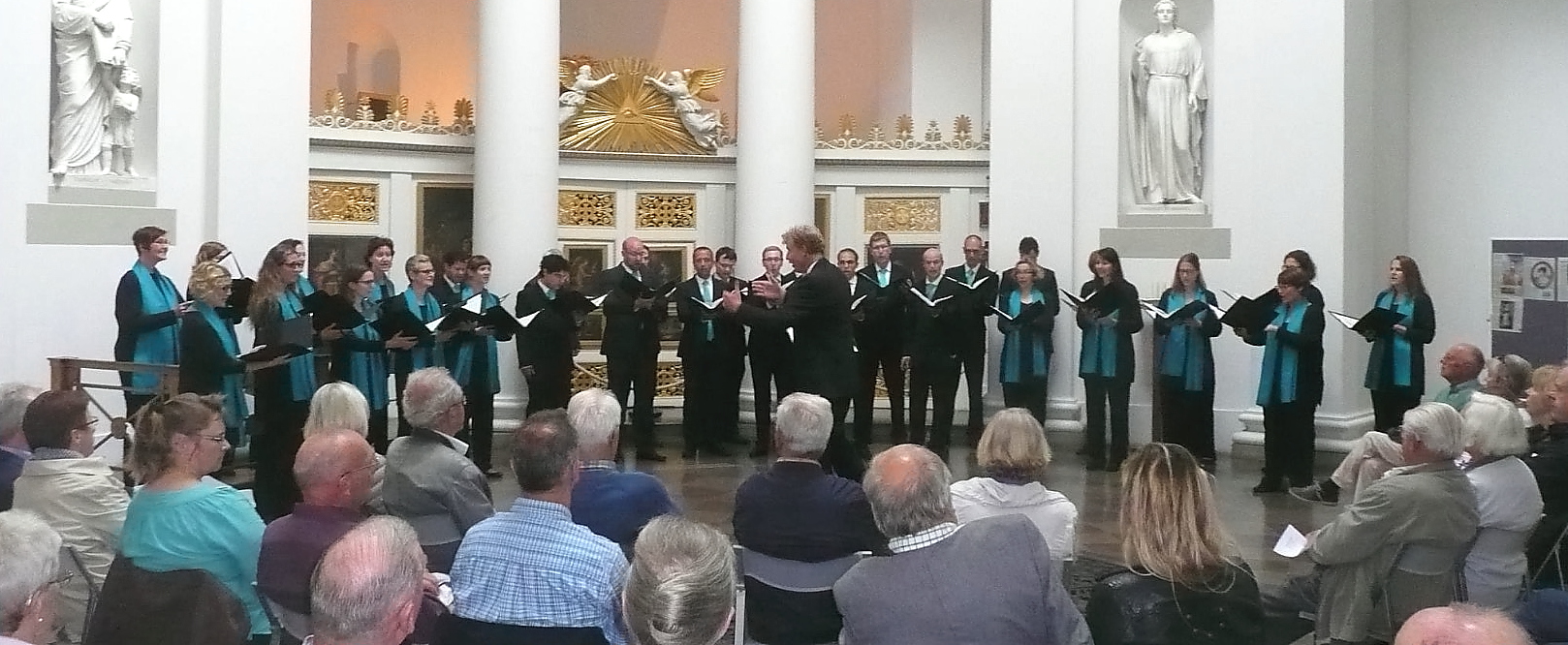 Die Matinee-Aufführung war wegen der limitierten Sitzplätze für die zahlenden Zuhörer zweimal durchzusingen. Tatsächlich füllten sich die Reihen in beiden Aufführungen recht üppig, so dass alle Interessierten die Chance zum Hörgenuss bekamen. Auf Wunsch unseres Maestros an das Publikum sollten bitte möglichst keine längeren Pausen zum Applaudieren entstehen, damit wir das umfangreiche Programm auch jeweils in der geplanten Zeit unterbringen konnten… :-)